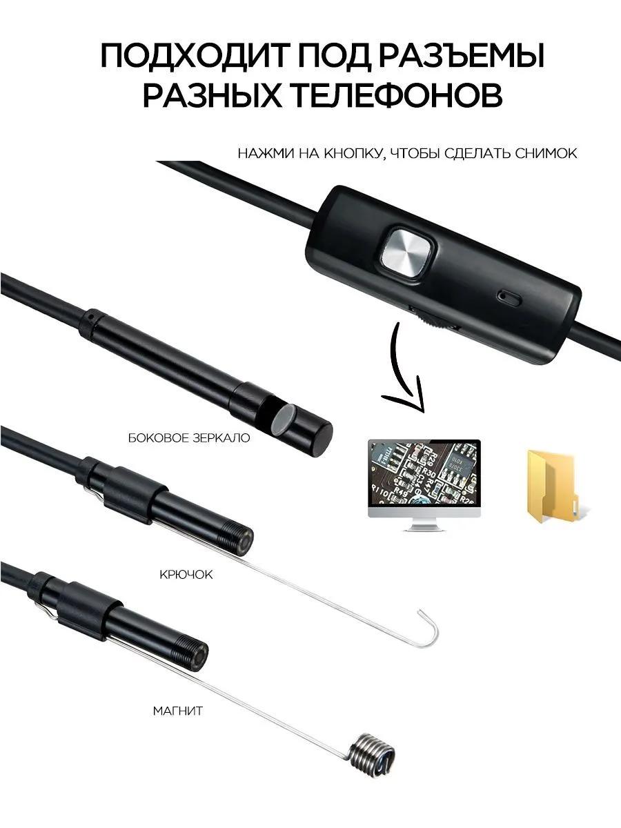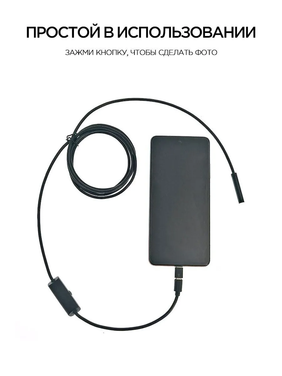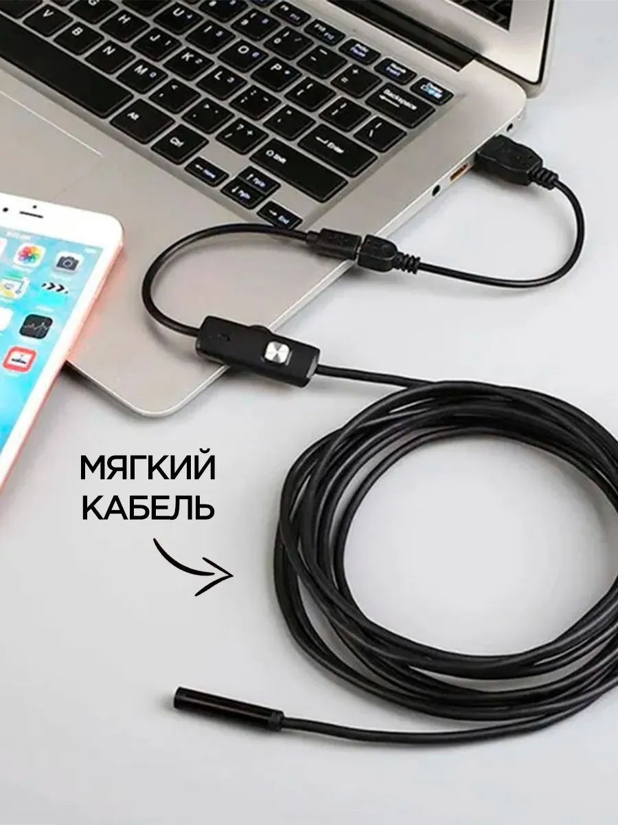 Гнучкий кабель Під'єднання з будь-якого смартфона, type c, планшета або комп'ютера, підтримує Windows і MacOS. Його можна під'єднати через usb, type c, micro usb. Камера ендоскоп для смартфона має гнучкий кабель, роздільну здатність HD 1024P (на ПК і ноутбуку) і 640P на смартфоні андроїд і регульовану світлодіодну підсвітку.